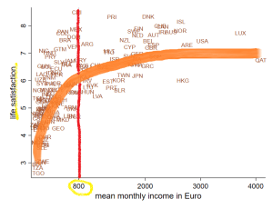 Three mechanisms are thought to govern the non-linear association of income and life satisfaction: the satisfaction of material needs, social comparison, and adaptation to life’s circumstances. We estimate the threshold for the fulfillment of basic material needs at approx. 800 Euros disposable income per month in Germany (GSOEP), in Munich (self-administered survey), and across 144 countries worldwide (World Database of Happiness). A new measurement method for social comparisons reveals that income comparisons are life-satisfaction-relevant for colleagues and average citizens, but not for friends and relatives. In sum, relative income (social as well as temporal) is more important for life satisfaction than absolute income.